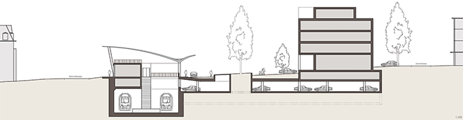 und Oben. Auch über den Bahneinschnitt erhält die Tiefgarage Tageslicht.