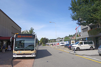 S-Bahn und Busstation lägen unmittelbar vor der Migros, Anlieferung von hinten und Parkplätze auf beiden Seiten der Geleise.