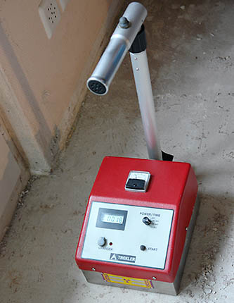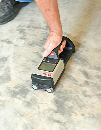 Sanierung eines Wasserschadens, verursacht durch zwischen Fundamentplatte und UB eintretendem Hangwasser. Bild ol: Neutronensondenmessgerät zur Konzentrationsmessung, or: Spezialscanner von Bosch zur Ortung der Bodenheizung,