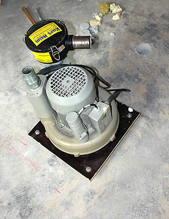 ul: Vakuum Pumpe mit Kernbohrung im UB, ur: Schadensbild im ehem. durch Schimmel befallen Türbereich.